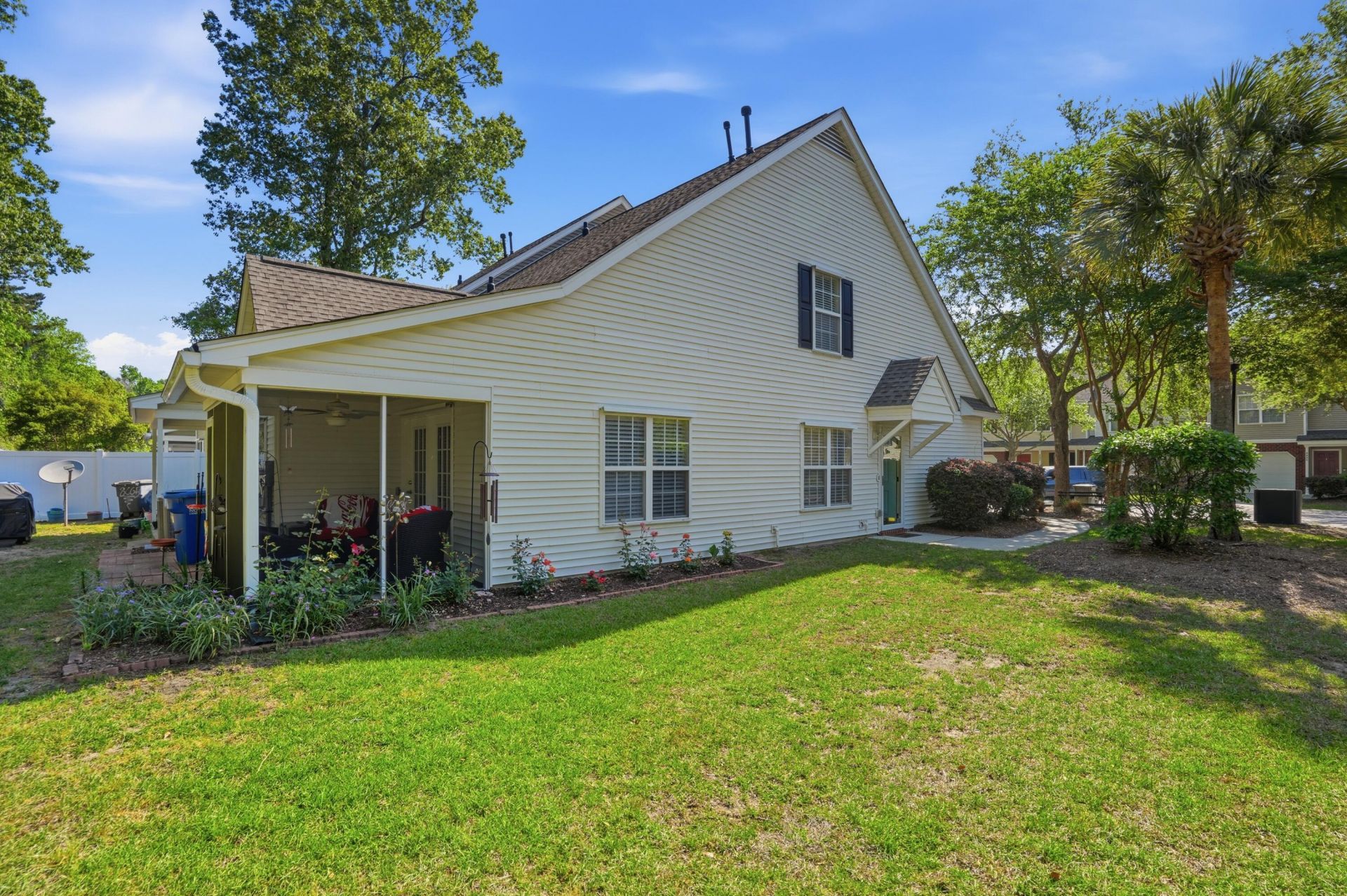 Discover the perfect blend of style and convenience in this meticulously maintained end-unit townhome located in the sought-after Coosaw Commons. If you've been looking for a home that handles the ''work'' for you, the HOA here has you covered--taking care of the landscaping and exterior so you can spend your weekends poolside or hitting the links at a local golf course. This 3 bedroom 2 1/2 bath features a private master retreat! Tucked away on the main level for ultimate privacy, the primary suite is a true sanctuary. It features its own vaulted ceiling and a generous walk-in closet. The real showstopper is the beautifully upgraded master bathroom, which has been transformed into a modern, spa-inspired space with high-end finishes--the perfect spot to decompress after a long day. Upstairoffers two additional large bedrooms and a second full bath to ensure there's plenty of room for family or guests. The living extends outside to a tranquil backyard that backs up to a private wooded buffer. Whether you're sipping a drink on the screened porch or letting the dog roam in the fenced-in yard, this space offers a peaceful escape from the daily grind. Unbeatable location close to major employers like Boeing, Mercedes-Benz, and Joint Base Charleston, plus world-class shopping at Tanger Outlets.